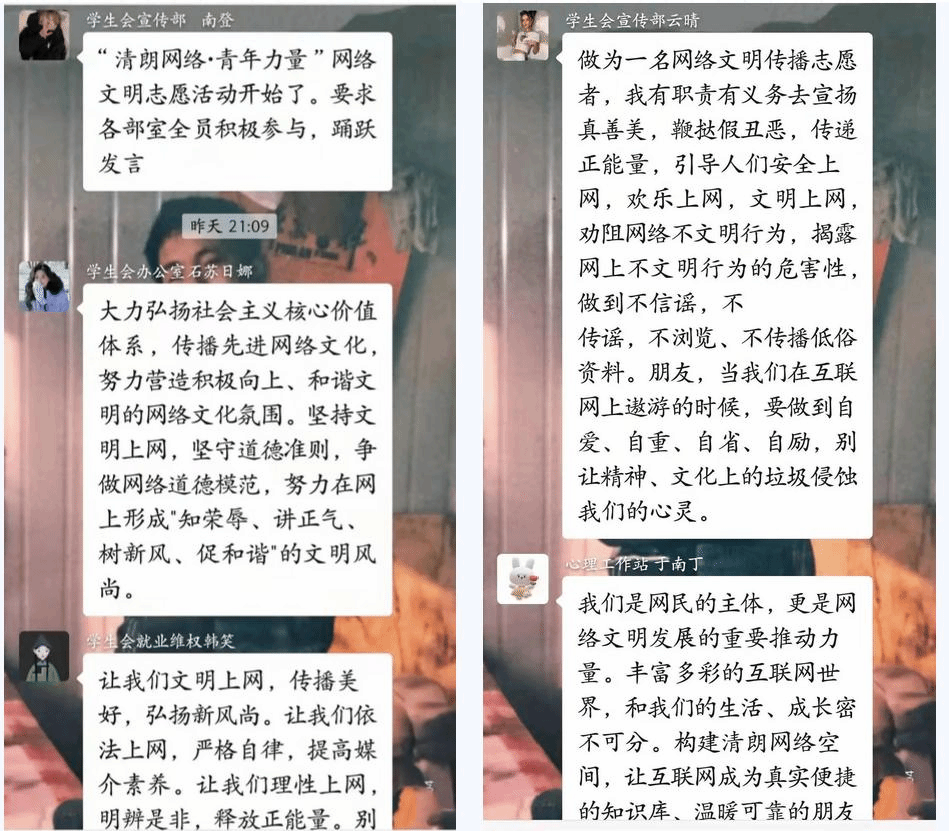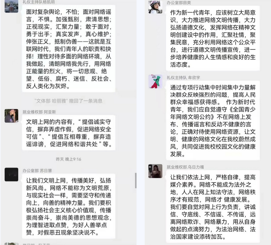为进一步培育和践行社会主义核心价值观,切实维护国家意识形态安全,动员广大青年积极参与构建网络安全空间,2022年3月4日21:00AC米兰官网志愿者服务总组织队各部室成员开展“清朗网络,青年力量”活动。通过微信参与有关网络文明话题讨论,引导同学们规范网络语言、举报不良信息、抵制网络谣言,帮助学生树立正确的网络观念,文明上网。